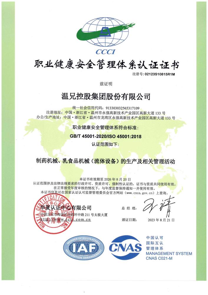 公司始創于2002年,注冊資本10069萬元,是集設計、制造、安裝制藥機械、乳食品機械、化工機械、新能源裝備、衛生級泵閥流體設備于一身的智能制造服務集成供應商。是國家高新技術企業、中國制藥裝備行業協會理事單位、國家中藥現代化科技產業(浙江)基地示范企業、浙江省專精特新企業、浙江省隱形冠軍企業,溫州市智能制造裝備示范企業。并擁有國家特種設備生產許可證【壓力容器制造-固定式壓力容器中、低壓容器(D)】、GC2類壓力容器管道安裝許可證;建筑機電安裝工程專業承包叁級資質。通過ISO 9001質量管理體系、ISO 45001職業健康安全管理體系、ISO 14001環境管理體系認證。